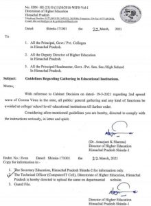 प्रदेश के शैक्षणिक संस्थानों में आयोजित कार्यक्रमों पर आगामी आदेशों तक रोक लगा दी गई है । इसे लेकर प्रदेश उच्च शिक्षा विभाग की ओर से निर्देश जारी किए गए है जिसमें कहा गया है कि किसी भी प्रकार की गैदरिंग को लेकर कोविड-19 की दूसरी वेव के मुताबिक जारी की गई गाइडलाइन के मुताबिक लोगों का एक साथ इकट्ठा होना सही नहीं है । लिहाजा स्कूल कॉलेज में आयोजित होने वाले कार्यक्रमों में सांस्कृतिक कार्यक्रम अधिकतर आयोजित किए जाते है लिहाजा आगामी निर्देशों के तहत इसे बंद रखने के निर्देश जारी किए गए हैं।