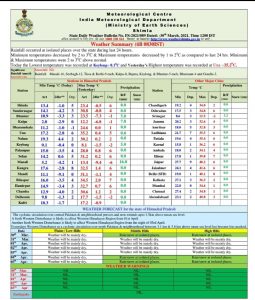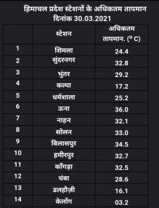 हिमाचल में अब दिन प्रतिदिन पारे में बढ़ोतरी दर्ज की जा रही है जिसमें प्रदेश के मैदानी इलाके ही नहीं बल्कि पहाड़ी क्षेत्रों के पारे का ग्राफ भी बढ़ गया है। मौसम विभाग के शिमला केंद्र ने साफ किया है कि फिलहाल 3 अप्रैल तक मौसम में कोई बदलाव नहीं होगा मौसम साफ रहने वाला है लेकिन इसके बाद 4 अप्रैल से 6 अप्रैल तक मौसम के मिजाज फिर से बिगड़ सकते हैं लेकिन अब मार्च के अंत में और अप्रैल के पहले सप्ताह के दौरान पारे का ग्राफ ज्यादा बढ़ सकता है ।जिसके अंदर मैदानी क्षेत्रों में अधिकतम तापमान में और बढ़ोतरी दर्ज की जा सकती है ।