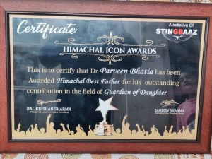 हिमाचल आइकन अवार्ड उन सभी लोगों को समर्पित किया जाता है जिन्होंने हमारे देश और समाज के लिए अपना जीवन दिया है। इसलिए डॉ प्रवीण भाटिया को guardian of daughter के क्षेत्र में उत्कृष्ट योगदान के लिए बेस्ट फादर का पुरस्कार दिया गया है।