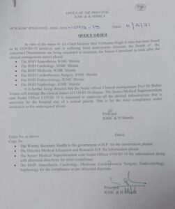 पूर्व मुख्यमंत्री वीरभद्र सिंह की देखरेख के लिए आईजीएमसी के छह मुख्य विभागों के विभागाध्यक्ष को जिम्मेदारी उनकी देखरेख को लेकर तय कर दी गई है। जिसे लेकर आईजीएमसी प्रशासन ने अधिसूचना जारी कर दी गई है। जानकारी के मुताबिक इसमें वह तमाम ऐसे विभाग शामिल किए गए हैं जिसके विभाग अध्यक्ष वीरभद्र सिंह के स्वास्थ्य पर कड़ी नजर रखेंगे और सभी विभागों के अध्यक्षों की देखरेख में दौरान वीरभद्र सिंह स्वास्थ्य लाभ लेंगे।