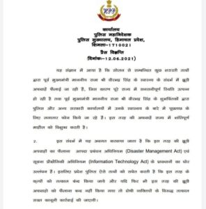 इसके साथ ही वीरभद्र सिंह के स्वास्थ्य को लेकर अफवाह फैलाने वाले शरारती तत्वों को लेकर भी पुलिस प्रशासन ने कड़ा रवैया अपनाया है
