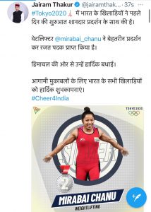 मुख्यमंत्री जय राम ठाकुर ने भारतीय खिलाड़ी मीराबाई चानू को टोक्यो ओलंपिक गेम्ज में रजत पदक जीतने वाली पहली भारतीय वेट लिफ्टर बनने पर बधाई दी।