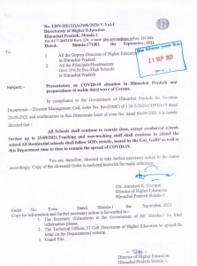 हिमाचल में स्कूलों को बच्चों के लिए अब 25 सितंबर तक बंद रखा गया है। सोमवार को मुख्य सचिव ने डिजास्टर मैनेजमंट ऐक्ट में कोरोना का हवाला देते हुए आदेश जारी कर दिए। इससे पहले 21 सितंबर तक स्कूलों को बंद रखा गया था। अब इस समय को और बढ़ा दिया गया है।
