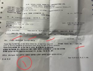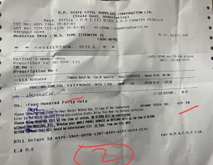 विषय की गंभीरता को देखते हुए जब हिमाचल प्रदेश सिविल सप्लाइज शॉप से Neemol इन्फ्यूज़न का सही बिल मांगा जाता है तो वह Neomol infusion कंप्यूटर पर न चढ़ा होने का हवाला दे कर पेन से लिख कर धुंधली सी स्टांप लगा कर दोबारा मरीज को थमा देता है इस पर जब मरीज द्वारा उससे दिए गए Neomol infusion का ही बिल देने के लिए कहा जाता है तो वो बिल फाड़ कर पैसे लौटा देता है और कहीं और से लेने के लिए कहता है ! घटना सीसीटीवी में निसंदेह रिकॉर्ड हुई होगी यदि बाद में उसे खराब न घोषित किया जाए !