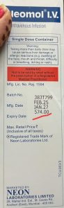 रोगी कल्याण समिति द्वारा संचालित डिस्काउंटेड शॉप में ट्रेड नेम Neomol (PCM) बैच संख्या L 447 इन्फ्यूज़न 33 रुपए छूट के बाद 301 रुपए में मिलता है ! इन्फ्यूज़न पर बैच संख्या 383T799 छपी होती है और 574 रुपए MRP अंकित होती है !