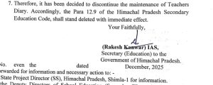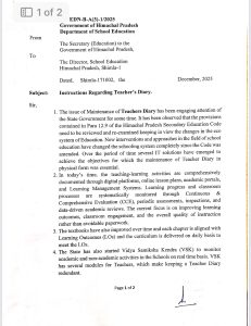 बदलते परिवेश एवं तकनीकी विकास के साथ शिक्षक डायरी को शिक्षकों के ऊपर अनावश्यक बोझ मानते हुए शिक्षा सचिव हिमाचल प्रदेश सरकार द्वारा जारी अधिसूचना के तहत शिक्षक डायरी को शिक्षा विभाग की शिक्षा संविदा से हटा दिया गया हे।