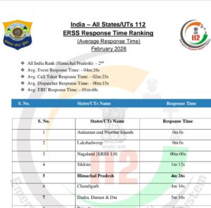 सीमित संसाधनों के बावजूद उत्कृष्ट कार्यशैली का परिचय देते हुए Himachal Pradesh Police की आपातकालीन प्रतिक्रिया सेवा (ERSS-112) ने फरवरी 2026 में पूरे देश में दूसरा स्थान हासिल कर ऐतिहासिक उपलब्धि दर्ज की है। यह उपलब्धि न केवल पुलिस विभाग के लिए गर्व का विषय है, बल्कि प्रदेश की जनता के विश्वास और सुरक्षा व्यवस्था की मजबूती का भी प्रमाण है।
