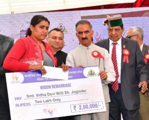 कार्यक्रम में मुख्यमंत्री सुख आश्रय योजना के तहत शिखा, सिमरन कौर, शिया तथा प्रेम लता को विवाह अनुदान के अन्तर्गत 60-60 हजार रुपये, महबूब हसन तथा रवि को मुख्यमंत्री सुख आश्रय योजना में दी जाने वाली मकान निर्माण के लिए दूसरी किश्त के रूप में एक-एक लाख रुपये दिये। मुख्यमंत्री शगुन योजना के अन्तर्गत संतोष देवी, शीला देवी तथा नीमो देवी को 31-31 हजार रुपये, विधवा पुनर्विवाह योजना के तहत नसिफा, नितेश तथा विधा देवी को दो-दो लाख रुपये, मुख्यमंत्री कन्यादान योजना के तहत बबीता, सुनीता देवी तथा अनीता देवी को 51-51 हजार रुपये प्रदान किये गए।
