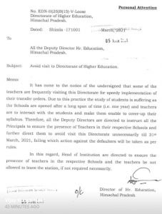 प्रदेश शिक्षा विभाग में ट्रांसफर के लिए चक्कर लगाने वाले शिक्षकों की खैर नहीं है। इसमें शिक्षा विभाग ने सभी उप निदेशकों को कड़े निर्देश जारी किए हैं कि इस पर खास नजर रखी जाए कि ट्रांसफर आर्डर को इंप्लीमेंट करवाने के लिए कई शिक्षक निदेशालय के चक्कर काट रहे हैं जिसके कारण स्कूली बच्चों की शिक्षा प्रभावित हो रही है इस पर शिक्षा विभाग ने प्रिंसिपल को भी सतर्कता बरतने के निर्देश जारी किए हैं।